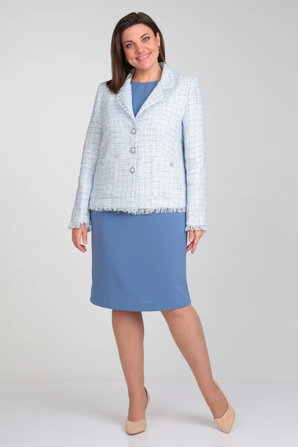 Комплект из двух предметов: жакет и платье. Стильный жакет прямого силуэта, однобортный с застежкой на 3 пуговицы, с накладными карманами по переду. Воротник пиджачного типа с лацканами. По краю борта, лацканам, отлету воротника и низу изделия - бахрома из основной ткани. Изделие на подкладке. Длина жакета - 63 см. Стильное платье из струящейся ткани полуприлегающего силуэта с декоративными подрезами. Застежка на потайную молнию в среднем шве спинки. Короткие цельнокроеные рукава. Длина платья - 104 см.