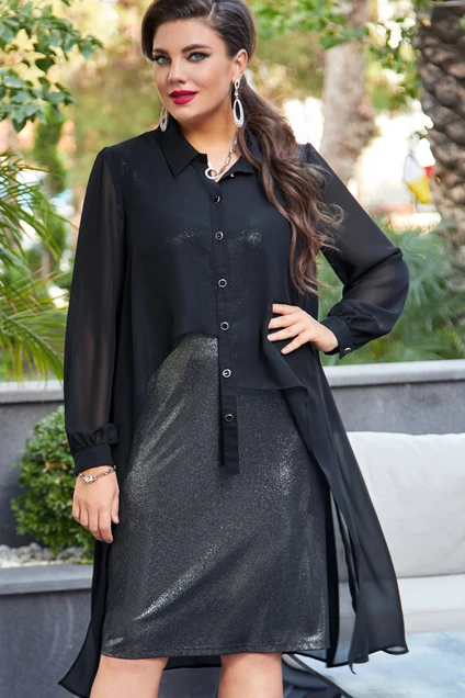Это просто бомба, а не комплект! Шикарная невесомая туника свободного кроя отлично дополняет блестящее платье. Идеально для любого случая! Комплект состоит из шифоновой туники и платья. Туника с воротником и планкой на декоративные пуговицы, нагрудные вытачки, низ ассиметричный, фигурной формы. Рукава втачные на манжетах с пуговицами. Платье полуприлегающего силуэта с круглым вырезом, без рукавов. Длина туники по спинке 108 см (р.52-56), 111см (р.58-62), длина рукава 63см. Длина платья 104см (р.52-56), 108см (р.58-62)