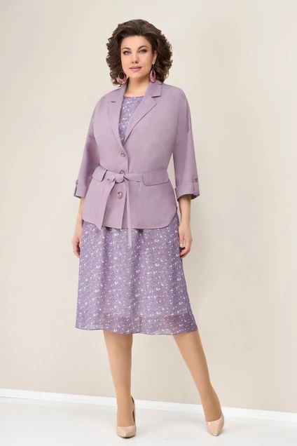 Нарядный комплект из легкого шифонового платья силуэта годе и жакета со съемным поясом. Жакет без подкладки, с закругленным низом и рукавом на цельнокроеной основе. Длина жакета по центру спинки- 64см. Платье на тонкой трикотажной подкладке, с коротким спущенным рукавом. Длина платья по центру спинки- 114см. Платье: полиэстер 100%.