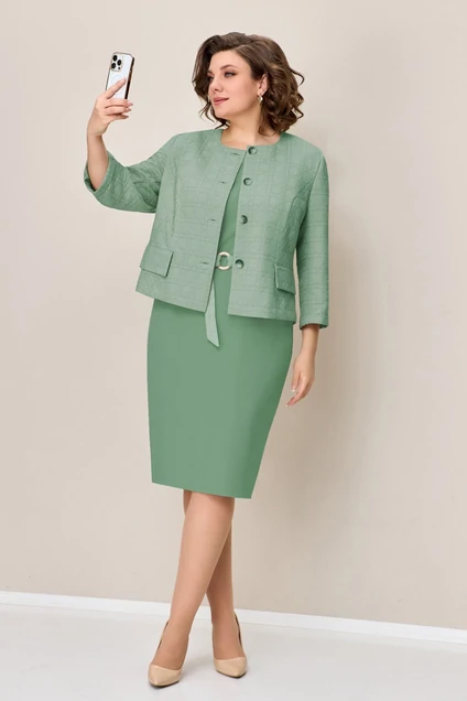 Костюм женский: жакет, платье. Укороченный жакет из стеганой ткани без подкладки с округлой горловиной и втачным рукавом. Длина рукава- 52см. Длина жакета по центру спинки- 56 см. Платье полуприлегающего силуэта из текстильной ткани со спущенным коротким рукавом. Длина платья по центру спинки 102 см. Пояс с пряжкой, из стеганой ткани- в комплекте изделия.
