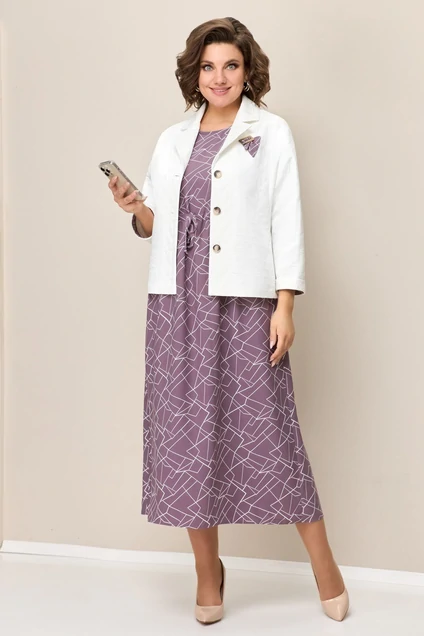 Костюм женский: жакет, платье. Классический жакет из легкой стеганой ткани с цельнокроеным рукавом 3/4, с застежкой на пуговицы. Длина жакета по центру спинки- 61см. Удлиненное платье прямого силуэта с кулисой и поясом немного выше талии. Рукав платья короткий спущенный. Длина платья по спинке-127 см. В комплекте изделия- пояс и съемная брошь. Платье: полиэстер 95%, эластан 5%.