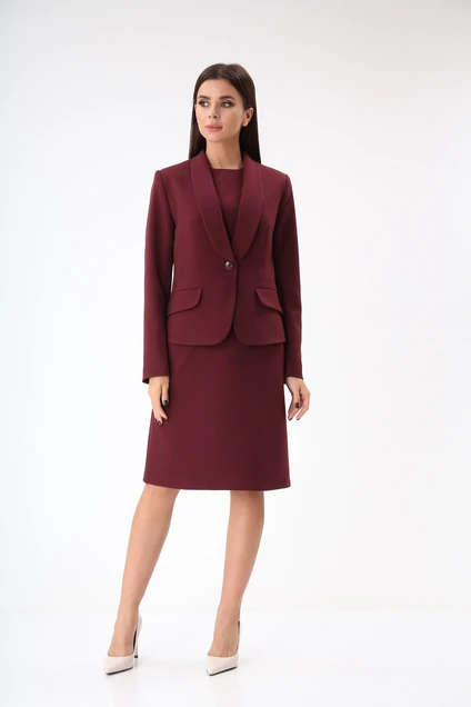 Комплект женский, состоящий из жакета и платья. Жакет на подкладке, укороченный прилегающего силуэта. Воротник «шалька». Застегивается на пуговицу. На полочке расположены карманы с клапаном. Рукав втачной, двухшовный. Длина рукава для роста 164 см 60 см, для роста 170 см 62 см. Длина изделия от плеча по спинке для роста 164 см 58 см, для роста 170 см 60 см. Платье женское прямого силуэта, отрезное по линии бедер. В шве по линии бедер расположены карманы. Спереди в верхней части платья рельефы. Горловина округлая, декорированная отделочной строчкой. Застежка по среднему шву спинки на молнию. Длина платья от плеча по спинке для роста 164 см 98 см, для роста 170 см 100 см.