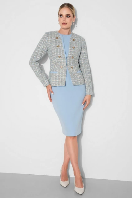 Прекрасный вариант выглядеть элегантно и женственно – иметь в арсенале стильный костюм, состоящий из жакета и платья. Такой базовый комплект – настоящая палочка-выручалочка для любой ситуации. Костюм женский комбинированный, состоит из жакета и платья полуприлегающего силуэта. Жакет женский полуприлегающего силуэта из костюмной ткани типа Chanel с фигурной линией борта и застежкой встык на 2 пришивных крючка, расположенных на уровне линии талии и 4 пуговицы расположенные вдоль борта несут декоративную функцию. Жакет на подкладке с плечевыми накладками. По переду жакет с рельефными швами и талиевыми вытачками, выходящими из горизонтального подреза расположенного чуть ниже линии талии, в котором обработан прорезной карман с листочкой. Листочка из отделочного материала. В верхней части борта узкая отделочная деталь из однотонной ткани, от горловины до линии талии. Спинка с рельефными швами, выходящими из проймы до низа и средним швом. Горловина круглой формы, обтачная. Линия борта внизу немного скошена. Рукава втачные двухшовные, длинные. В нижней части локтевого шва - разрез, обработан обтачкой из отделочной ткани. Платье женское полуприлегающего силуэта с цельнокроеным рукавом, с отрезной нижней частью. Переднее полотнище платья отрезное по линии талии, в верхней части рельефные швы, выходящие из проймы до линии талии. В нижней части стачаны вытачки идущие на продолжение рельефов. Спинка платья с талиевыми вытачками и средним швом, в нижней части которого обработан разрез. В среднем шве обработана застежка на потайную тесьму-молнию. Горловина круглой формы, обработана обтачкой. Длина жакета по среднему шву спинки - 59,0 см (±3,0 см), Длина рукава - 61,5 см (±2,0 см), Длина платья по среднему шву спинки - 111,0 см (±4,0 см) Состав: