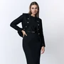 Горловина овальной формы, обтачная. Средняя длина жакета по среднему шву спинки - 68,0 см, Средняя длина рукава жакета - 61,5 см. Средняя длина платья по среднему шву спинки - 110,0 см, средняя длина рукава платья - 20,5 см Тип ткани на жакет: костюмно-плательная.