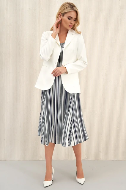 Горловина овальной формы, обтачная. Средняя длина жакета по среднему шву спинки - 68,0 см, Средняя длина рукава жакета - 61,5 см. Средняя длина платья по среднему шву спинки - 110,0 см, средняя длина рукава платья - 20,5 см. Тип ткани на жакет: костюмно-плательная