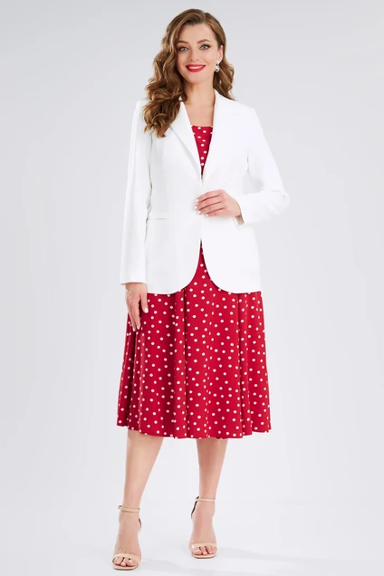 Платье с жакетом, прекрасный выбор для вашего образа, который будет сочетать в себе удобство и женственность. А платье в горошек - нестареющая классика, оно всегда актуально и модно. Костюм женский состоит из двух предметов: жакета полуприлегающего силуэта и платья силуэта “песочные часы”. Костюм предназначен для повседневной носки.