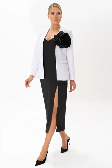 Этот женский костюм - воплощение изысканности и утонченного вкуса. Белый жакет придает образу свежести и современности, а черное платье на бретелях подчеркивают женственность и элегантность. Съемная брошь в виде большого цветка добавляет костюму нотку богемности и позволяет легко менять аксессуары, подстраиваясь под разные ситуации. Вместе эти элементы создают стильный и универсальный наряд, идеальный для уверенной в себе женщины, знающей силу своей привлекательности.