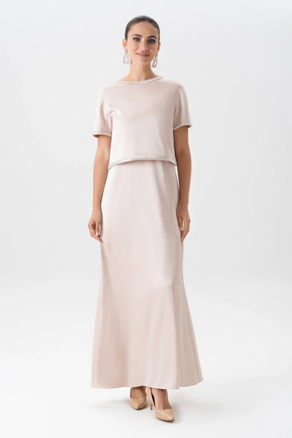 Низ переда, спинки и рукавов, горловина, застежка спинки вдоль молнии декорированы отделочной тесьмой из сетки с нашивными бусинами (размер и цвет фурнитуры может незначительно отличаться от фото).