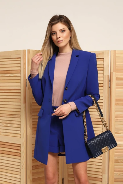 Костюм женский 3х предметный,состоит из жакета,джемпера,шорт. Жакет жен. Притачного силуэта на подкладке с центрально-бортовой застежкой,по переду на три петли и пуговицы.Жакет однобортный с остроугольными лацканами.По переду нагрудная вытачка выходящая из прорезного кармана и отрезной бочок.Чуть ниже талии прорезные карманы с листочкой,с втачными концами и клапаном.Спина со средним швом.В среднем шве шлица.Рукав втачной двухшовный.По окату рукава две вытачки. дл рукава61,дл 36см Шорты женские прямого кроя с застежкой на брючную тесьму молнию.По переду со складками и боковыми карманами.По задним половинам шорт вытачки.Пояс обтачной с застежкой на одну петлю и пуговицу.По низу шорт манжета. длина 36см Джемпер свободного кроя с втачным рукавом.Горловина-стойка.Длинный рукав. Длина 60см
