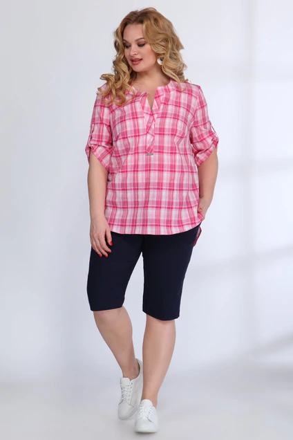 Комплект женский, состоящий из блузы и шорт. Летняя стильная блузка полуприлегающего силуэта. Перед с нагрудными вытачками и планкой застежкой на 3 петли-пуговицы. Планка застежка плавна переходит в планку горловины. Спинка прямая. Рукав длиной 3/4 прямой одношовный. На рукаве пата, благодаря которой модна регулировать длину. Горловина полукруглой формы, обработана планкой. Шорты полоприлегающего силуэта, спортивного стиля. В боковых швах расположены карманы "хулиганы". По боковому шву и вход в карман выполнена декоративная отделочная строчка. Пояс шорт собирается на эластичную тесьму, кроме этого может регулироваться по ширине талии при помощи декоративного шнура.
