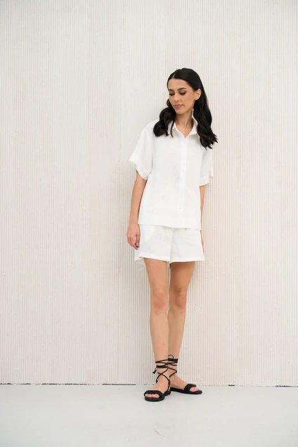 Комплект двойка из лёгкой натуральной ткани, в белом цвете. Комплект состоит из рубашки с коротким рукавом и шорт. Рубашка свободного прямого кроя, по переду застежка на пуговицы. Шорты на резинке, по бокам функциональные карманы
