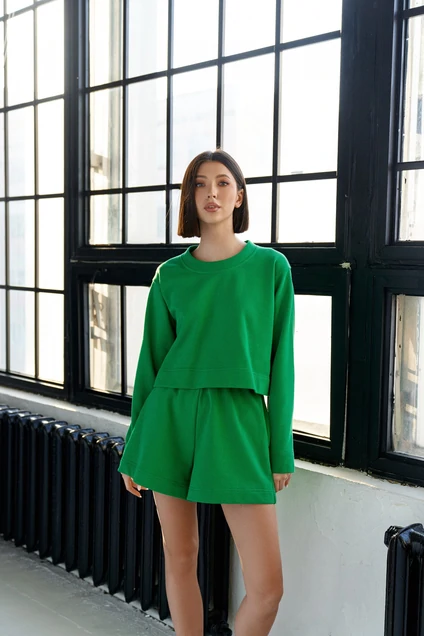 Комплект женский двух предметный состоящий из джемпера и шорт. Джемпер свободного прямого кроя. Горловина овальная. Рукав длинный , спущен. Длина джемпера 46, длина рукава 59. Шорты женские прямого кроя. Пояс шорт на широкой резинке со сборкой. В боковых швах карманы. Длина шорт 40 см.