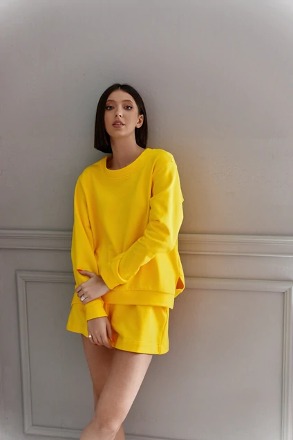 Комплект женский 2-х предметный состоящий из джемпера и шорт выполнен из трикотажной хлопковой ткани. Джемпер прямого свободного кроя. Горловина овальная . Рукав свободного кроя, спущен. В боковых швах разрезы. Длина изделия 62, длина рукава 73 от края горловины. Шорты свободного кроя. Пояс шорт на резинке со сборкой. По бокам прорезные карманы. Длина изделия 42 см.