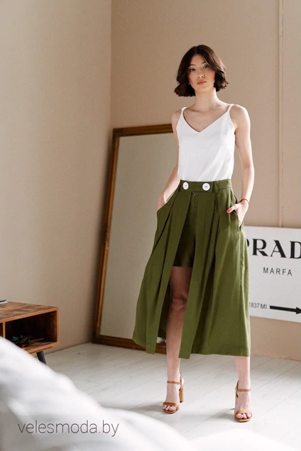 Юбка - шорты из плательной ткани. Шорты свободного кроя на стабильном поясе, застежка - потайная тесьма молния - по переду изделия. Юбка нашита в области пояса - не сьемная. По переду изделия две декоративные пуговицы.