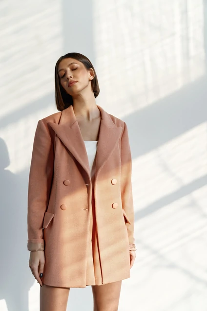 Комплект 2-х предметный состоящий из жакета и шорт. Жакет женский на подкладке прямого силуэта. Жакет двубортный с остроугольными лацканами. Застежка - пуговицы в два ряда по переду изделия. Рукав втачной. По переду нашиты крупные карманы . спинка со средним швом. Длина изделия 74, длина рукава 62. Шорты женские прямого , свободного кроя. Пояс шорт - резинка. В боковых швах карманы. Длина изделия 40 см.
