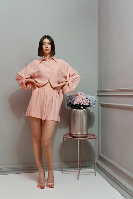 Комплект женский двух предметный состоящий из рубашки и шорт. Рубашка женская прямого кроя с рукавом со спущенным плечом. Воротник рубашечного типа. Застежка по переду на петли – пуговички. В боковых швах разрезы. Спинка отрезная со сборкой. Рукав без манжет, с пуговичкой по верху рукава и скрытым элементом для удержания рукава при сборке. По переду нашиты карманы. Длина изделия 80, длина рукава 74 от края горловины. Шорты прямого свободного кроя. Пояс шорт на резинке с мелкой сборкой, с кулиской. В боковых швах карманы. Длина изделия 38 см.