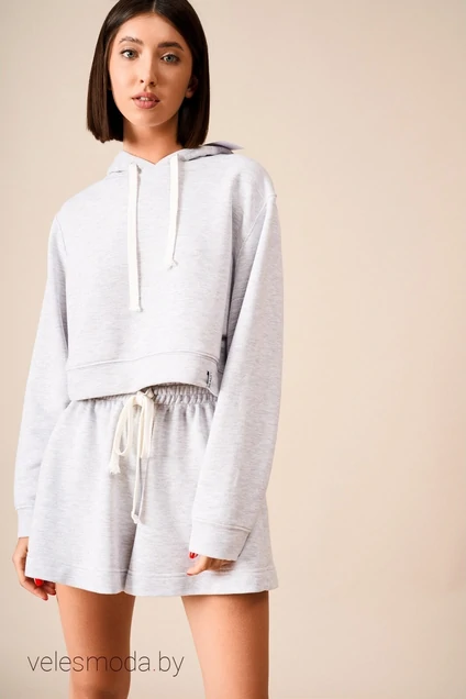 Комплект 2-х предметный состоящий из джемпера и шорт. Джемпер укороченный, прямого свободного кроя с капюшоном. Рукав спущен, пройма рукава широкая, по низу манжет. Длина изделия 43, длина рукава 63. Шорты женские прямого кроя. Пояс шорт на широкой резинке со сборкой. В боковых швах карманы. Длина шорт 39 см.
