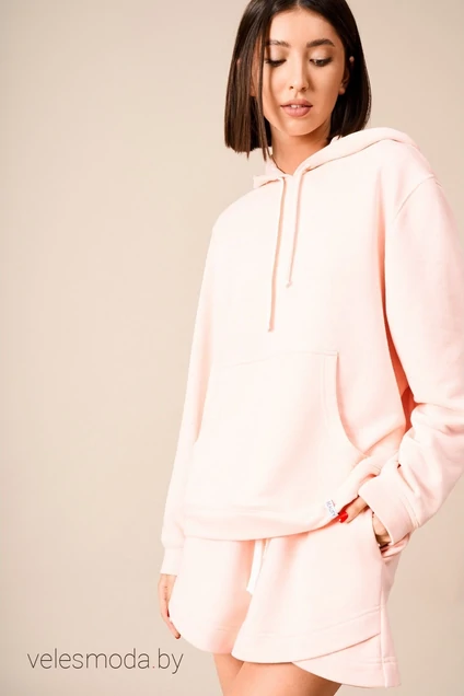 Комплект женский двух предметный состоящий из джемпера и шорт. Джемпер свободного прямого кроя с капюшоном с рукавом со спущенным плечом, по низу рукава манжет. По переду нашит карман. Длина джемпера 60, длина рукава 64. Шорты женские прямого кроя. Пояс шорт на широкой резинке со сборкой. Низ шорт двухслойный, фигурный . В боковых швах карманы. Длина шорт 39 см.
