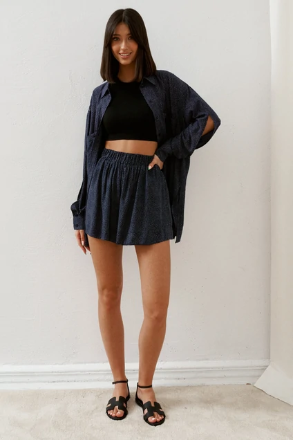 Комплект состоит из двух предметов рубашка с декоративными разрезами по рукавам и шорты, выполнен из вискозного темного полотна в принт мелкий горошек. Каждый предмет комплекта позволит Вам создавать новые образы.