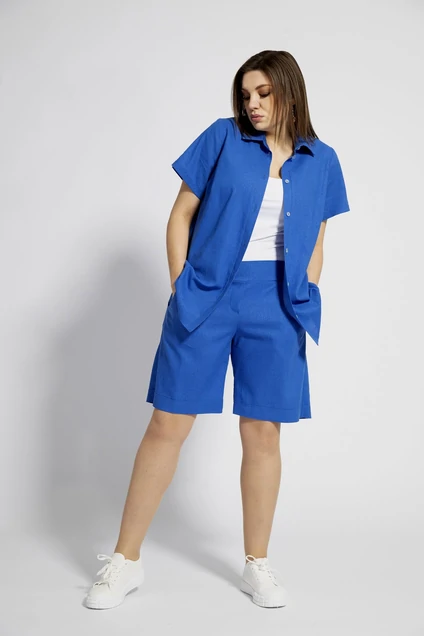 Комплект прямого силуэта, состоящий из рубашки и шорт. Идеальный летний комплект, который дарит чувство лёгкости и комфорта. Выполнен из текстильной льняной ткани. Горловина обработана отложным воротником на отрезной стойке. Перед блузы застёгивается с помощью петель-пуговиц, расположенных на притачной планке.