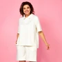 Яркий стильный женский комплект свободного кроя, состоящий из блузы - поло и шорт, выполнен из трикотажной, мягкой, растяжимой ткани с эффектом перелива. Отличный вариант для насыщенного впечатлениями лета. Потрясающе удобный и трендовый костюмчик с укороченными шортами, который должен быть в гардеробе любой модницы!