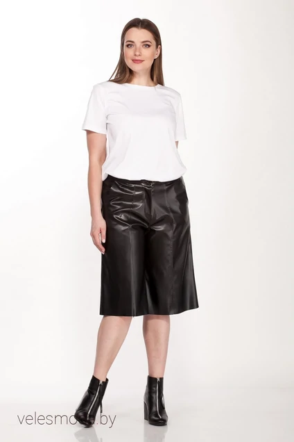 Кюлоты полуприлегающего силуэта с высокой посадкой выполнены из эко-кожи с добавлением эластана. Пояс без резинки, с застежкой молнией на пуговицу, по бокам обработаны функциональные карманы, на спинке с одной стороны накладной карман. Длина кюлот 63 см.