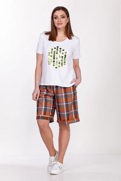 Комплект женский двухпредметный состоит из майки и шорт. Майка полуприлегающего силуэта выполнена из вискозы. Горловина круглая с притачной планкой, рукав втачной короткий, полочка украшена аппликацией. Длина майки- 62 см. Шорты с высокой посадкой, выполнены из костюмной ткани в клетку с добавлением спандекса. Пояс без резинки, с застежкой молнией на пуговицу. В боковых швах карманы с листочкой, по низу манжет с отворотом, длина- 56 см.