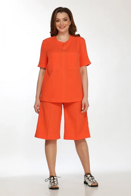 Комплект женский двухпредметный состоит из блузки и шорт выполнен из хлопковой ткани с добавлением эластана. Блузка прямого силуэта разрезом по центру горловины и накладными карманами, рукав короткий втачной с манжетами, снизу в боковых швах разрезы. Длина блузки по спинке 70 см, длина рукава 27 см. Шорты женские классические с высокой посадкой, выполнены из легкой костюмной ткани с добавлением спандекса. Пояс без резинки, с застежкой молнией на пуговицу. В боковых швах обработаны карманы, длина шорт- 64 см.