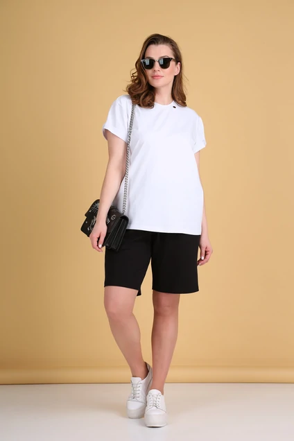 Трикотажные шорты, по талии резинка и шнурок. На передних половинках карманы хулиганы. Длина по боковому шву 55 см. Длина по шаговому шву 29 см. Футболка свободного кроя. По низу рукава манжета. Длина изделия по спинке 48-54 - 61 см.; Длина рукава 48-54 - 16 см.;