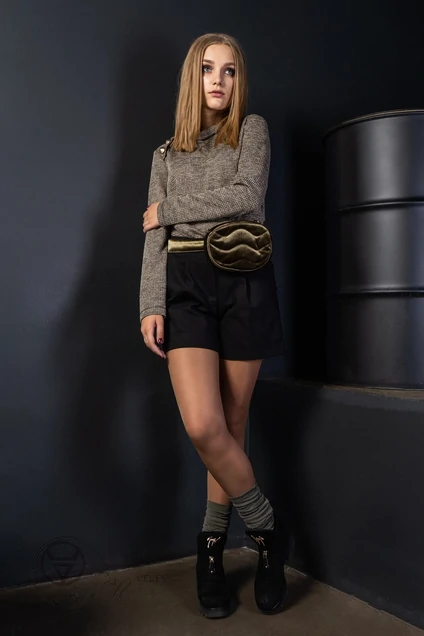 Комплект состояит из джемпера и шорт. Джемпер полуприлегающего силуэта из мягкого трикотажа декорирован тремя пуговицвми золотистого цвета в стиле glam casual. Длина -60 см, Длина рукава-60 см. Шорты из плотной ткани с добавлением хлопка декорированы кантами в боковых швах. Длина шорт-39 см, ширина манжета-4 см.