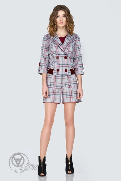 Комплект состоит из куртки-блузок и шорт. Блузон спортивного стиля выполнен из ткани в клетку без подкладки. По низу изделия приточная резинка. Застежка двубортная на петли и пуговицы. Рукав 7/8 с патой. Блузон без вотника. Шорты с карманами на поясе обтачки. Длина шорт 40 см