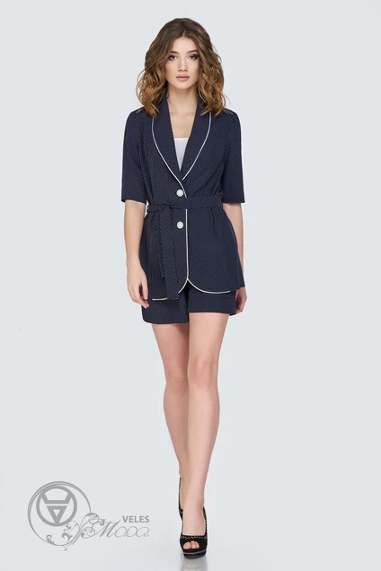 Комплект выполнен из шелкоиз шелковой ткани,состоит из блузона,майки-топ и шорт. Блузон прямого силуэта с отложным воротником-шалькой.Рукав короткий ,блузон с поясом.В боковых карманах отделан белым кантом. Длина жакета 75 см Майка-топ на брительках Длина майки:28 ссм шорты с карманами ,на поясе.Длина шорт:40 см