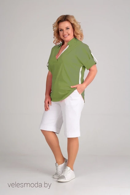 Блузон прямого силуэта с нагрудной вытачкой от бокового шва, со спущенным плечом и отворотом застёгивающимся на пату.Воротник рубашечного типа.Отделка-декоративная тесьма.Блузон 96% вискоза,4% спандекс
