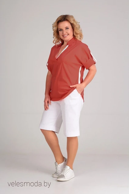 Костюм женский с шортами .Блузон прямого силуэта с нагрудной вытачкой от бокового шва, со спущенным плечом и отворотом застёгивающимся на пату.Воротник рубашечного типа.Отделка-декоративная тесьма.Шорты из стрейчевого джинса, с карманами в боковых швах, с застёжкой молнией на притачном поясе с частичной резинкой. Длина блузона по спинке 69см.,длина рукава от горловины 44см.