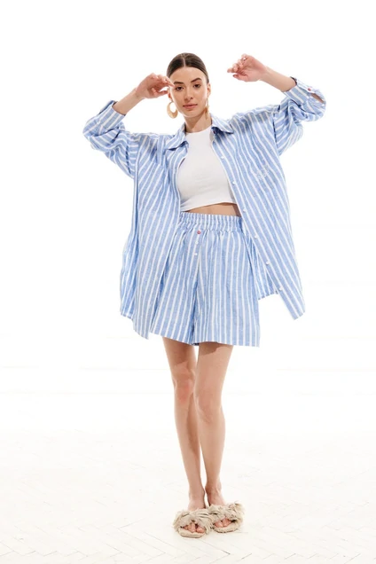 Комплект женский двухпредметный (блузка+шорты) из костюмно-плательной ткани. Блузка свободного силуэта, длиной ниже линии бедер, со спущенной линией плеча. Перед с накладными карманами, на левом кармане - вышивка, центральной цельнокроеной планкой с застежкой на петли, пуговицы. Спинка с отрезной кокеткой цельнокроеной с кокеткой переда и бантовой складкой по середине. Рукав одношовный, длинный, на притачной манжете с застежкой на петли, пуговицы. Воротник рубашечный на отрезной стойке. Шорты длинной выше линии колен, с застежкой имитацией спереди, функциональными карманами с подкройным бочком. Шорты с широким притачным поясом на резинке. Длина блузки 83 см, рукав от горловины 77 см. Длина шорт 44 см.
