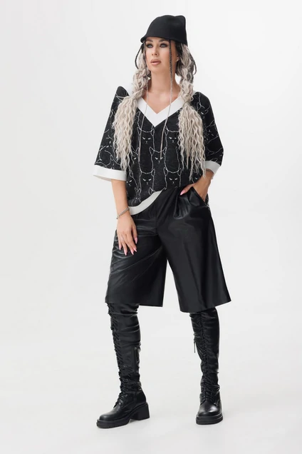 Комплект женский, состоящий из джемпера и шорт. Джемпер прямого силуэта, со спущенной линией плеча и V- образным вырезом горловины, выполнен из трикотажного полотна с довязами. Шорты прямого силуэта. Передняя часть с карманами и складками. Застёжка на молнию, петлю и пуговицу. Пояс притачной, с резинкой по задней части. По низу шорт широкая подгибка.
