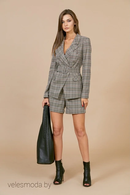 Комплект: жакет, шорты. Комплект выполнен из костюмной ткани в клетку. Жакет приталенный, двубортный, на подкладке, по переду - прорезные карманы в рамку с клапаном, рукав с пятью пуговицами. Шорты с карманами спереди, с узкими отворотами по низу, застежка на декоративную металлическую молнию в среднем шве сзади. Длина жакета - 66 см. Длина рукава - 62,5 см. Длина шорт с поясом - 41 см