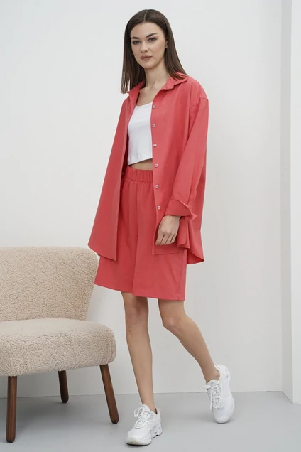 Каждый новый сезон нам хочется обновить гардероб и непременно купить что-нибудь модное и актуальное. Желаете выглядеть незаурядно и выразительно? Льняной комплект с шортами - прекрасный пример одежды в стиле smart casual. Свободная широкая рубашка с длинным рукавом на манжете, шорты на эластичном поясе, удлинённые, с карманами в боковых швах. Длина рубашки около 82 см. Длина рукава около 58 см. Длина шорт около 42 см