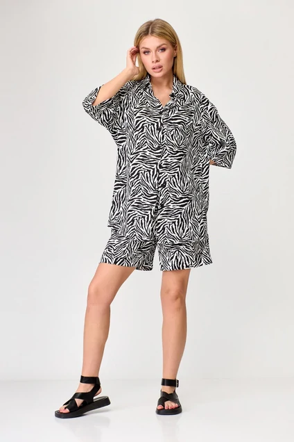 Костюм женский, состоящий из шорт и рубашки. Рубашка свободного силуэта, застёгивается на пуговицы.Рукав короткий без особенностей.