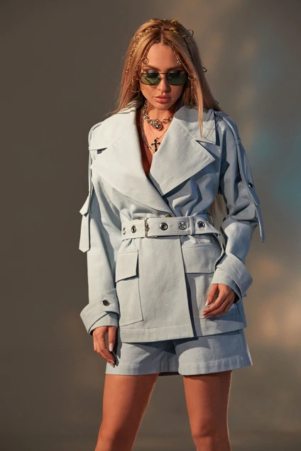 жакет с центральной застежкой на петли и пуговицы, отложным воротником и лацканами. Плечо спущенное. По переду с накладными карманами с клапаном. Спинка с кокеткой. Плечо и рукав с двойной патой, зафиксированной к рукаву петлей и пуговицей. Жакет со съемным поясом.Шорты с отрезным поясом, застежкой- гульфик. Пояс со шлевками. На передних половинках карманы. Вход в карман наклонный к боковому шву. Задние половинки с отрезными кокетками.