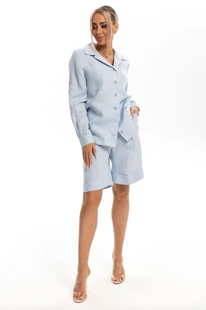 Блузка с центральной застежкой на петли и пуговицы, отложным воротником и лацканами. По переду с накладными карманами на уровне груди. Спинка цельная. Шорты с отрезным поясом, застежкой- гульфик. Пояс присборен резинкой в области спинки. На передних половинках карманы. Вход в карман наклонный к боковому шву. По низу шорт- отложные манжеты.