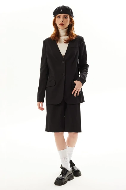 жакет с центральной застежкой на петли и пуговицы, без воротника, с V-образным вырезом горловины. По переду с рельефами, выходящими из проймы, талиевыми вытачками, прорезными карманами с клапанами и двумя обтачками. По правой полочке на уровне груди прорезной карман с листочкой. Спинка со средним швом, рельефами, выходящими из проймы. Рукав втачной, длинный. Шорты с отрезным поясом. В области спинки пояс присборен на резинку. Передние половинки с карманами, вход в карман наклонный к боковому шву. Застежка гульфик.
