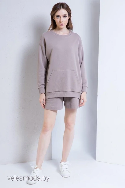 Модный трикотажный костюм из хлопка, состоящий из худи и шорт. Худи oversize прямого силуэта с карманом кенгуру спереди, длиной 67 см, со спущенной линией плеча и длинным рукавом на манжете. Широкие короткие шорты с карманами в боковых швах. Длина шорт - 40 см. Удобный актуальный костюм, который впишется в любой гардероб.