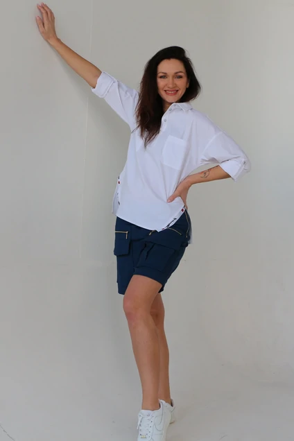 Шорты:Шорты женские, повседневные, прямого силуэта. Передние половинки шорт с резаными кокетками на которые настрочены фигурные шлевки, с накладными карманами с клапаном, выше которых настрочена планка с декоративной молнией. Задние половинки шорт с резаными кокетками на которые настрочены фигурные шлевки, и карманами с листочкой. По кокеткам, карманам, клапанам проложена отделочная строчка.