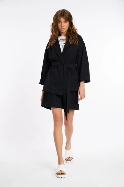 Жакет со съемным поясом, который завязывается на талии, длина до середины бёдра.Шорты женские, прямого силуэта, умеренного объема.