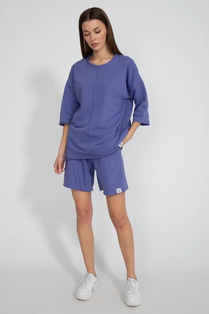 Комплект шорты и свитшот. Шорты женские средней посадки: карманы боковые в швах, низ без обработки, без шнурков. Свитшот оверсайз: необработанный край низа, с отделкой по центру переда. Ткань футер 3-х нитка.