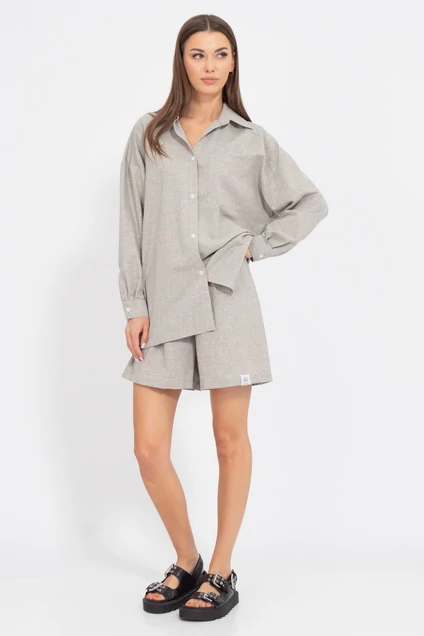 Костюм состоящий из шорт льняных свободного кроя с карманами в боковых швах и рубашки льняной свободного кроя со спущенными рукавами и накладным карманом. Прекрасно сочетается с брюками модели 4076, джемпером модели 4075, рубашкой 4081, джоггерами 4082. Ткань лен с вискозой. Рост 170