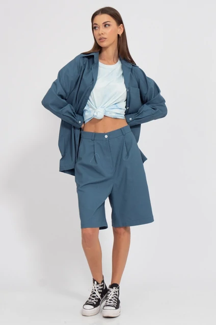 Костюм состоящий из блузы свободного силуэта с приспущенным рукавом и свободных шорт, удлинённых до колена. Эта комбинация идеально подойдёт для создания модных и удобных образов в теплое время года.