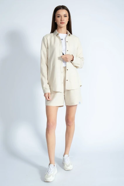 Костюм. Рубашка лен полуприлегающего силуэта с втачными рукавами, удлиненная по спинке. Обработка низа рубашки в форме овала. Шорты лен свободного кроя. Карманы в боковых швах. Уход Только деликатная стирка 30 градусов, не использовать отбеливатели, изделие вывернуть наизнанку