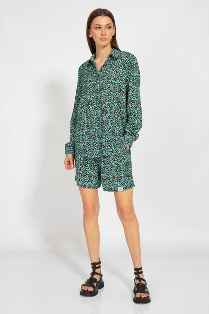 Костюм. Рубашка вискоза полуприлегающего силуэта с втачными рукавами, удлиненная по спинке. Обработка низа рубашки в форме овала. Шорты вискоза свободного кроя. Карманы в боковых швах.
